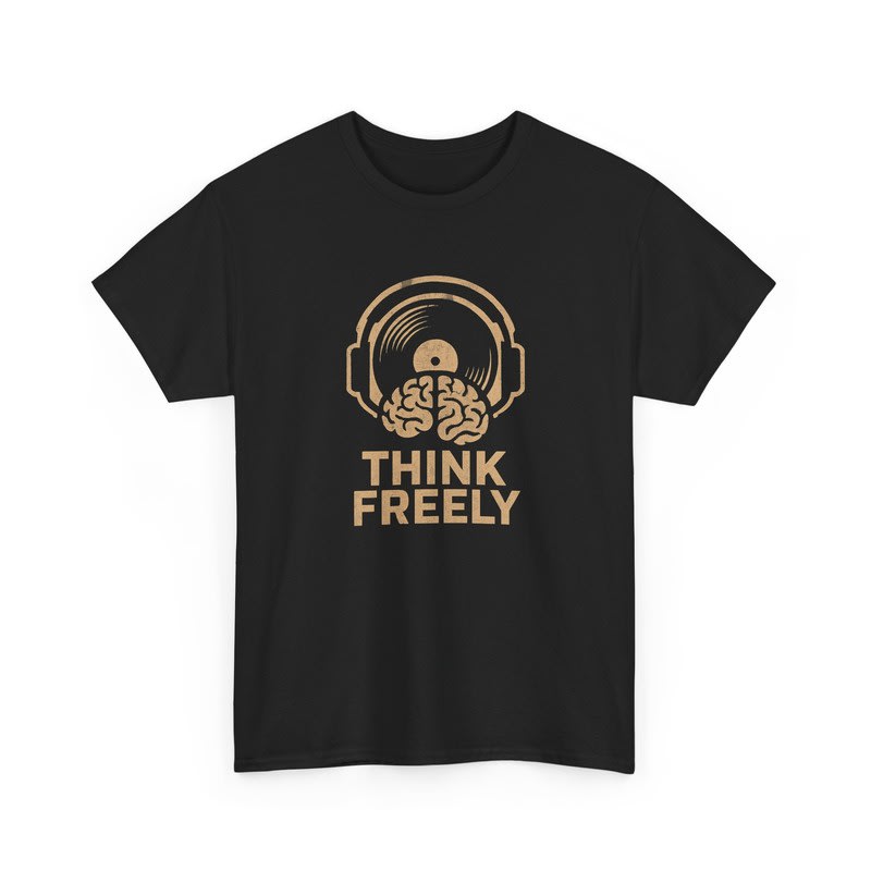 From the moment I laid eyes on it, the quiet confidence of this classic cotton tee was undeniable. It features a warm bronze graphic that immediately grabs attention without being loud. The intricate design — a vinyl record merging with a brain, beautifully framed by headphones — is a visual symphony. Below this striking imagery, the words "THINK FREELY" are elegantly placed, inviting curiosity and conversation, rather than demanding it.